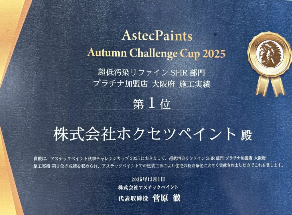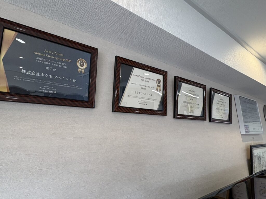 今回の「アステックペイント Autumn Challenge Cup 2025」大阪府施工実績 第1位の受賞により、ホクセツペイントのショールームには、また新たな表彰実績が加わりました。