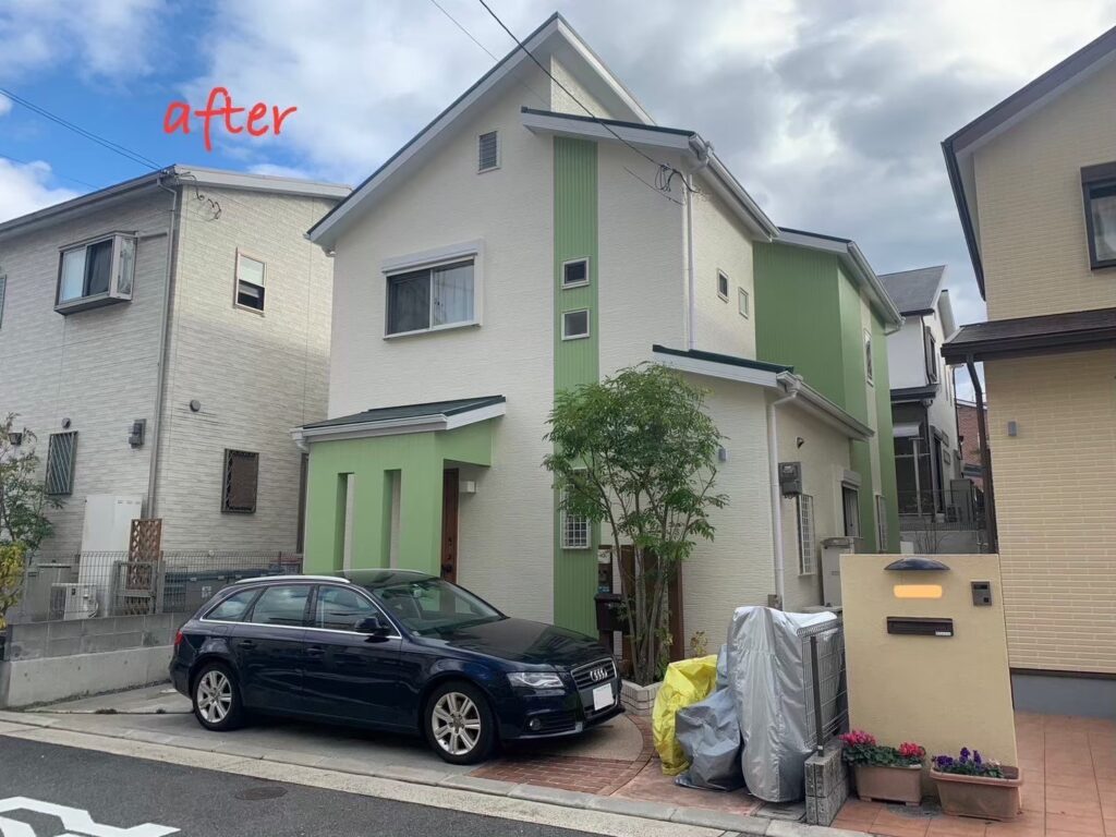 【寝屋川市 外壁塗装】施工事例|寝屋川市S様邸:ナチュラルベージュ×グリーンが映...
