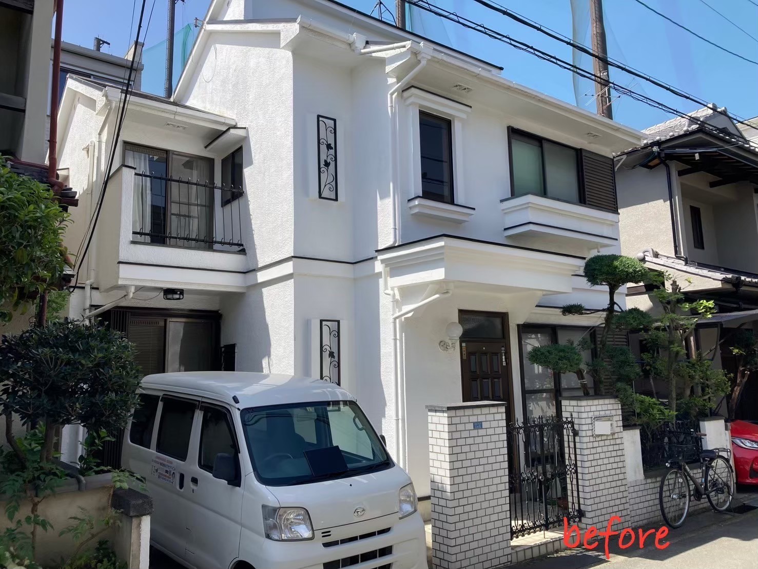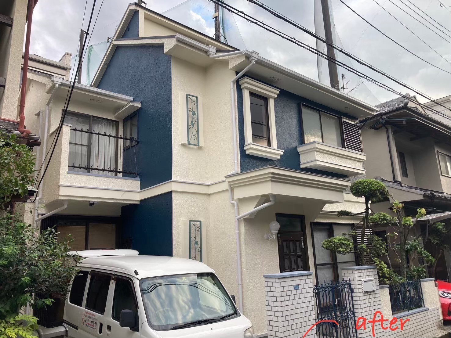 摂津市のM様邸にて、外壁・屋根・付帯部の塗装工事を実施しました。外壁と屋根には高耐候性・低汚染性に優れた「リファインSi-IR(艶有)」を使用し、ベースは柔らかな「ブロークンホワイト」で統一。アクセントに深みのある「マウンテンブルー」を用いることで、洗練された個性を引き立てました。屋根の「チャコール」カラーと合わせ、落ち着きと品格を両立した外観に仕上がっています。