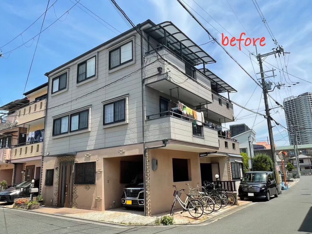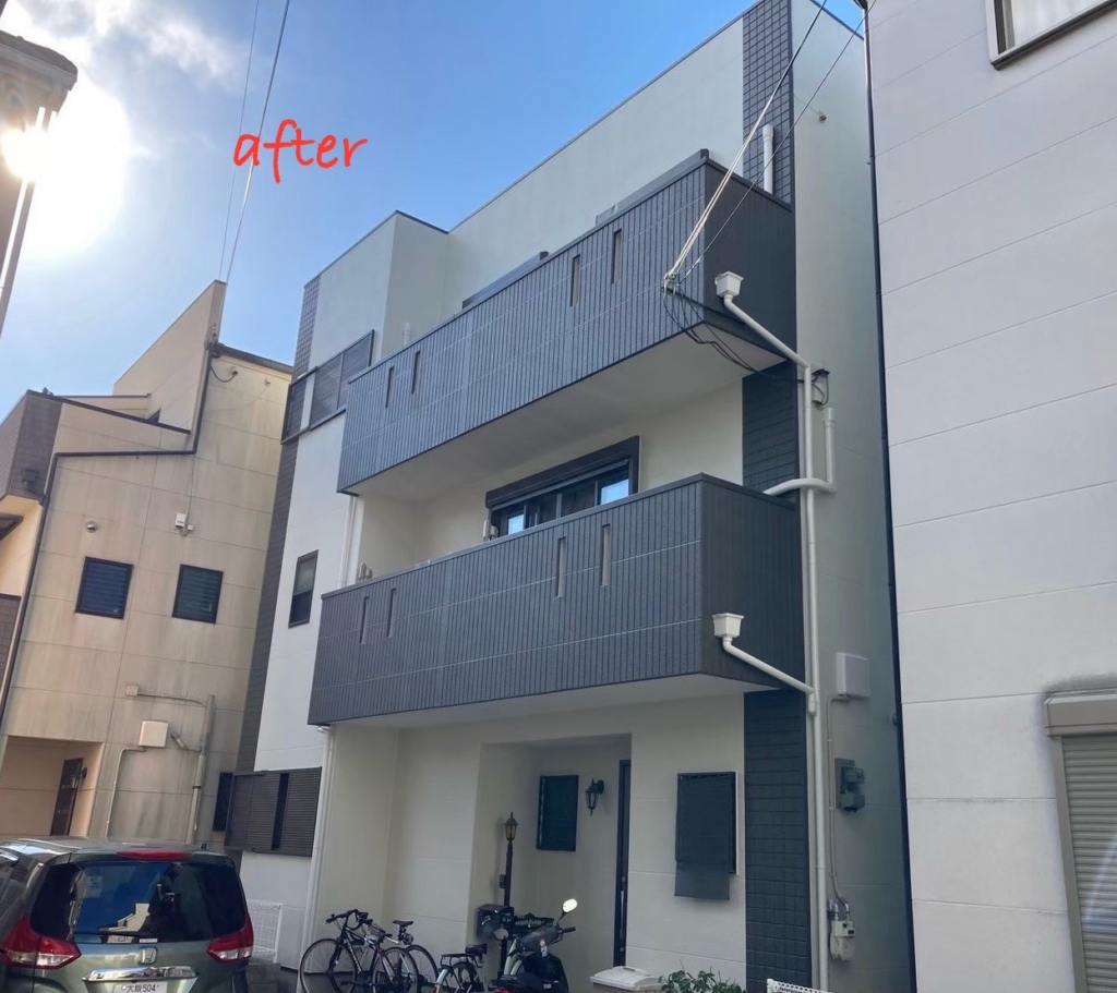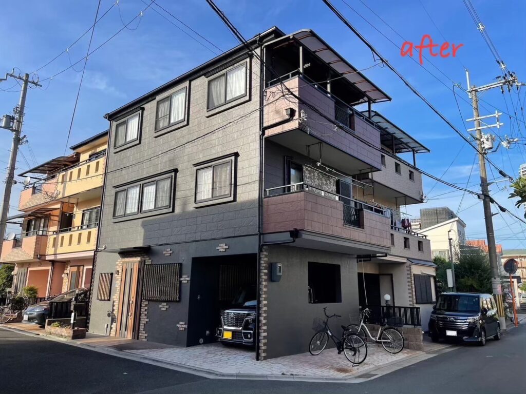 もともとは明るいグレーとベージュ系のツートンカラーのお住まいでしたが、経年劣化による色あせが気になっていました。今回、メインの外壁をウィザードコッパーで塗り替えたことで、建物全体の輪郭が引き締まり、まるで新築のように生まれ変わりました。